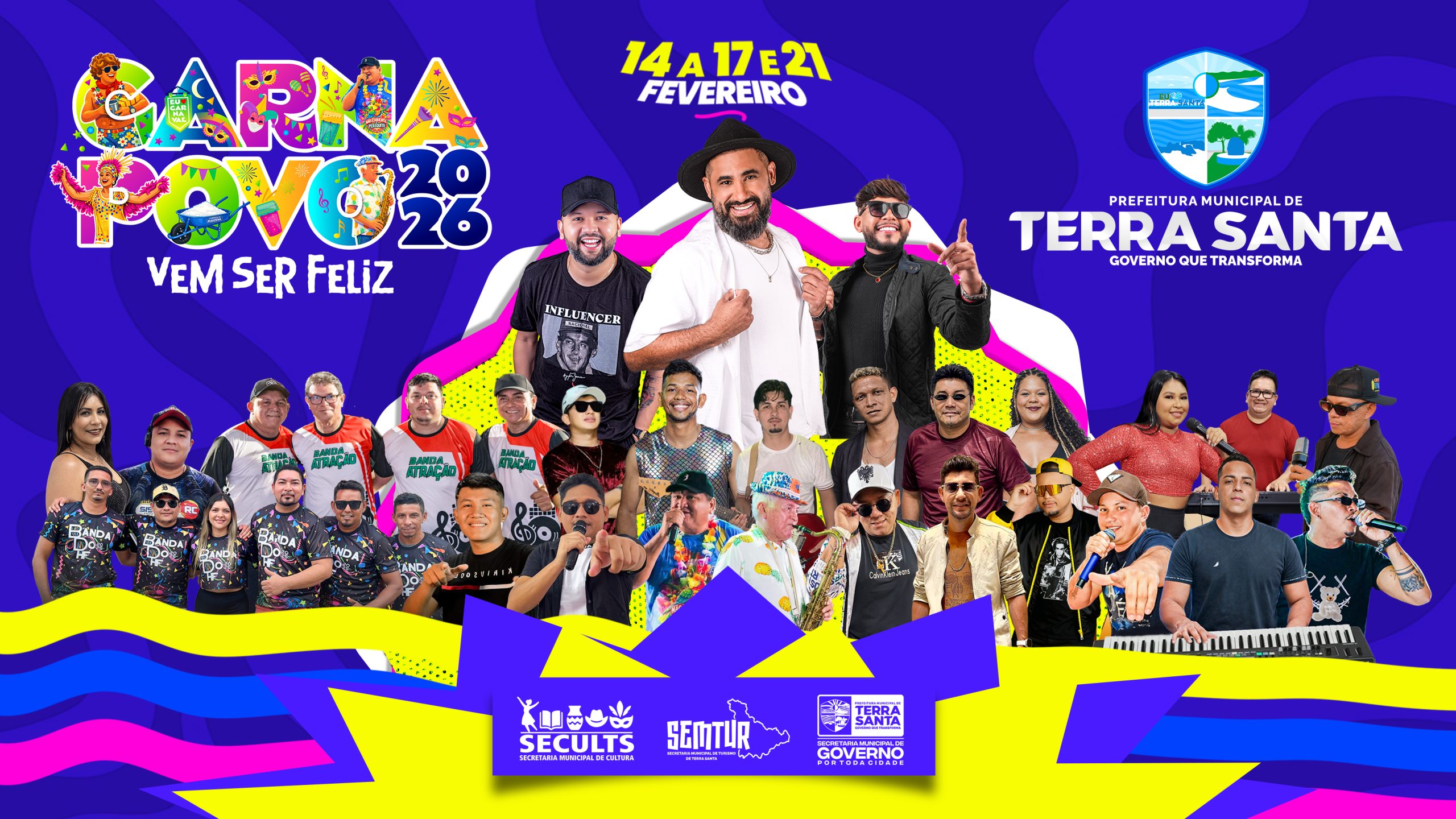 A Prefeitura de Terra Santa, por meio da Secretaria Municipal de Cultura, divulgou oficialmente a programação do Carnapovo 2026, que neste ano chega com o tema “Vem ser feliz”. Consolidado como um dos maiores eventos populares do Baixo Amazonas, o Carnapovo cresce a cada edição e promete, mais uma vez, entrar para a história do município.